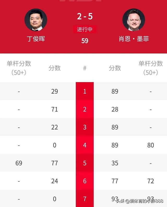 第五局,丁俊晖拼长台上手,联结围绕黑球迫切,在打了8套红黑组合后走位欠安,失去冲击147满分杆的契机,但在打出单杆69分,刚刚超分之时打黑球诞妄!墨菲上手得到31分转入明慧。丁俊晖天然解球诞妄,墨菲随后出现诞妄,丁俊晖以73-35扳回一局。第六局,丁俊晖拼长台诞妄,肖恩墨菲上手拼进长台,可是K球诞妄,丁俊晖上手仅拿到24分出现诞妄,肖恩墨菲哂纳大礼,轰出单杆72分,以77-24再赢一局,大比分4-2拿到赛点!第七局,肖恩墨菲莫得再给丁俊晖契机,轰出单杆93分好像胜出。从而以5-2大捷丁俊晖,强势晋级八强!