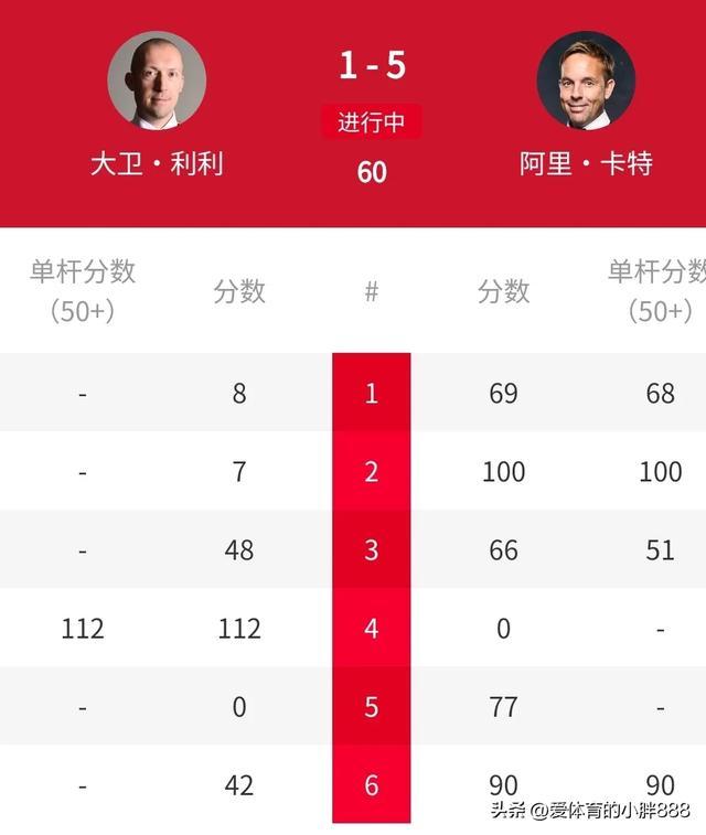 开局,卡特火力全开,轰出单杆100分,68分,51分,献技三连鞭好戏,大比分3-0越过。出头出面的大卫•利利回敬一杆112分,大比分1-3过期投入局间休息!