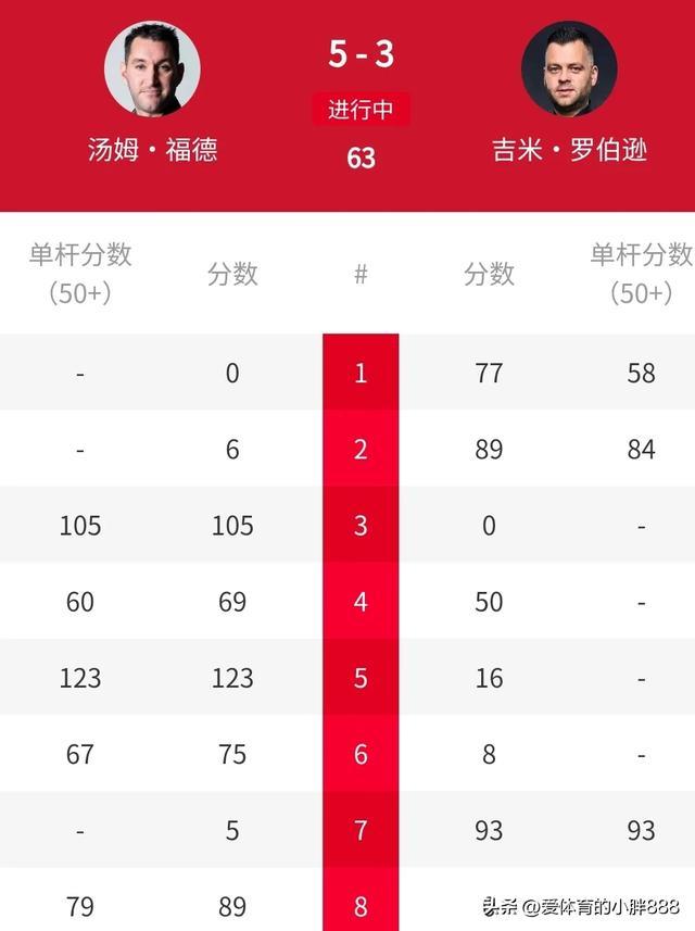 暂停归来后,汤姆福德碰到火热现象,轰出单杆123分,67分,献技四连鞭好戏,4-2拿到赛点。第七局,吉米•罗伯逊打出一杆93分,救济一个赛点。大比分追至3-4!第八局,汤姆福德轰出单杆79分好像胜出,从而以5-3淘汰吉米•罗伯逊,晋级八强!